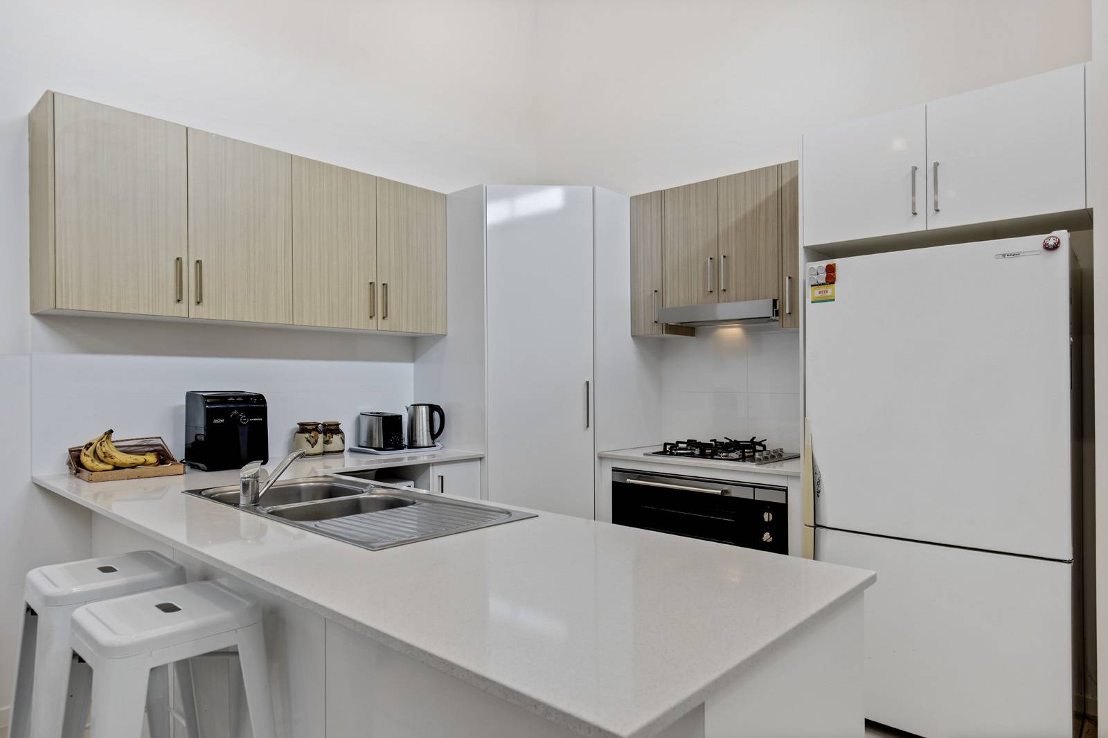 Large galley style kitchen with stone bench-tops, dishwasher & gas cooktop, 900mm electric oven