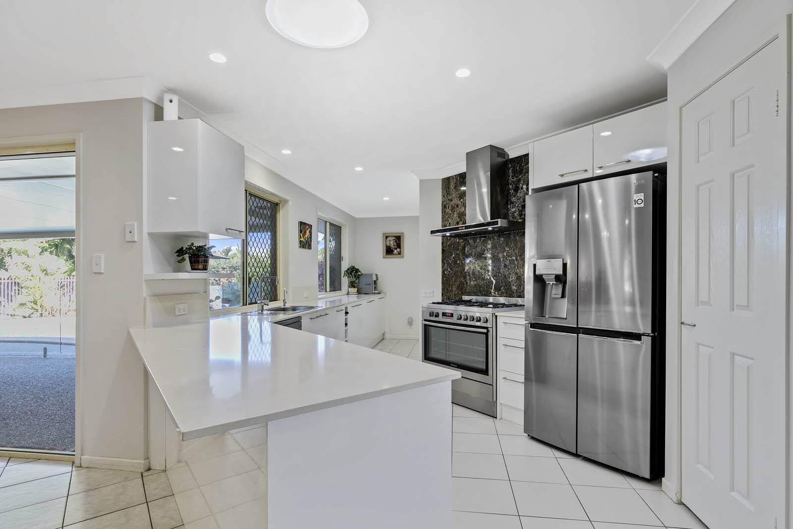 The kitchen over looks the saltwater swimming pool and outdoor entertainment area. Caesar stone bench tops, 900mm gas cooktop & oven, dishwasher, soft closed drawers, huge pantry & breakfast bar with a skylight installed for plenty of natural light.