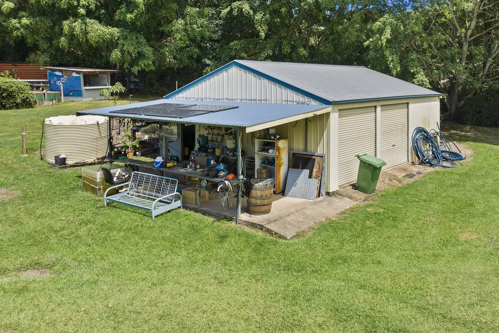 The property also features a 6m x 9m workshop with mezzanine floor, solar panels, tank with pump to water surrounding gardens,  solar hot water to residence. A 6kw solar system with 18 panels & 6.5kw invertor, Taylex wastewater treatment system. Water tanks & pumps to every structure on the property in total 90,000 litres plus the dam.
