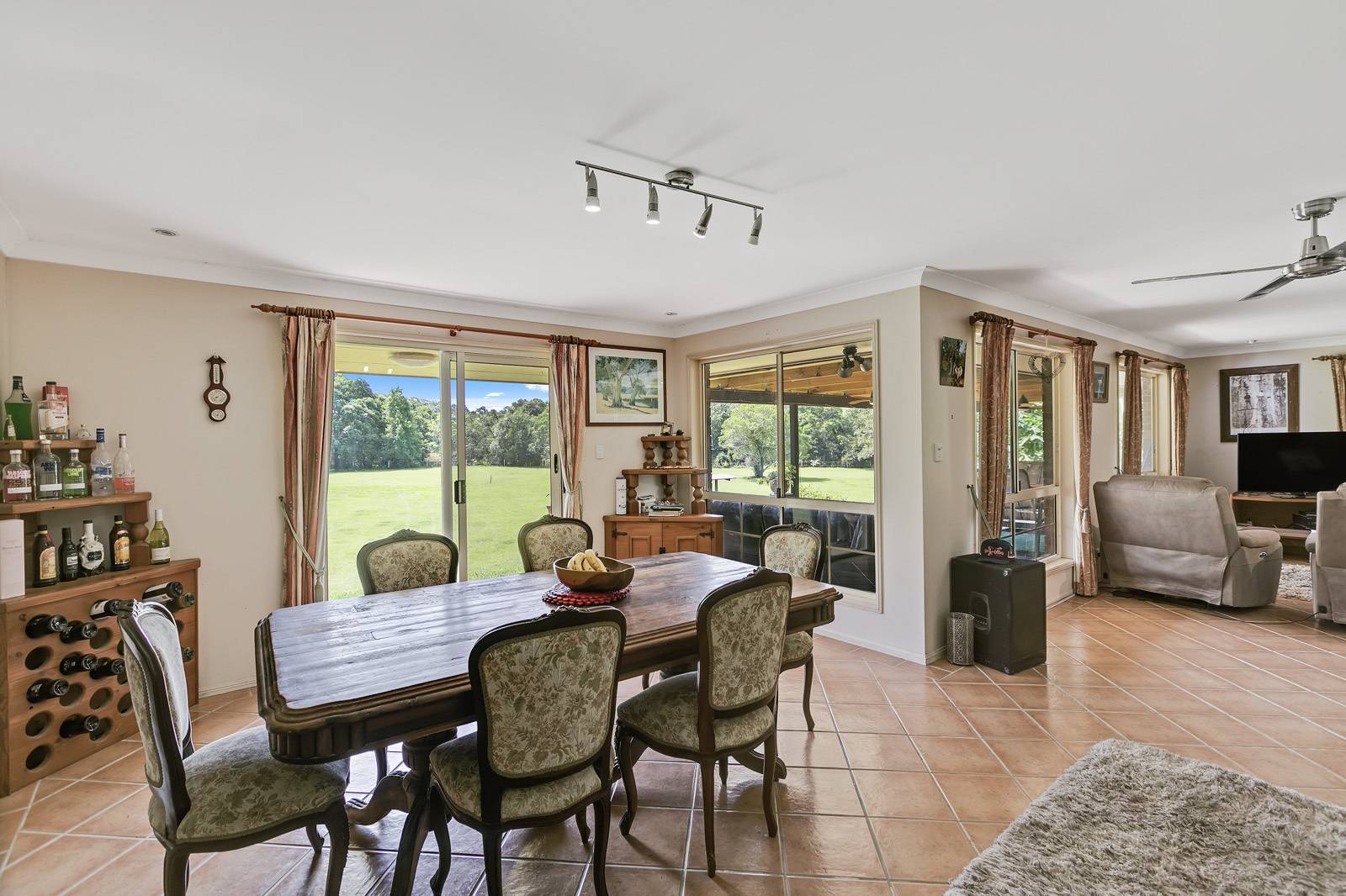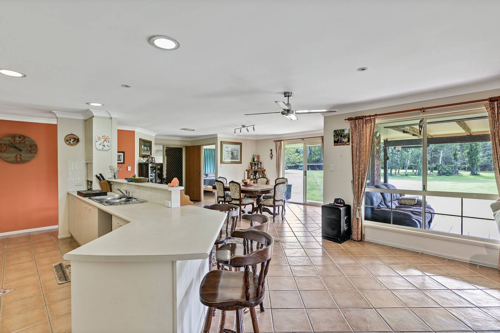 Fully tiled with a generous open plan kitchen overlooking a large formal dining & family area.  Every room has a view overlooking the property. Step out of the house to your wrap around alfresco veranda where you will spend a majority of time relaxing & watching  the kids & animals playing for hours.