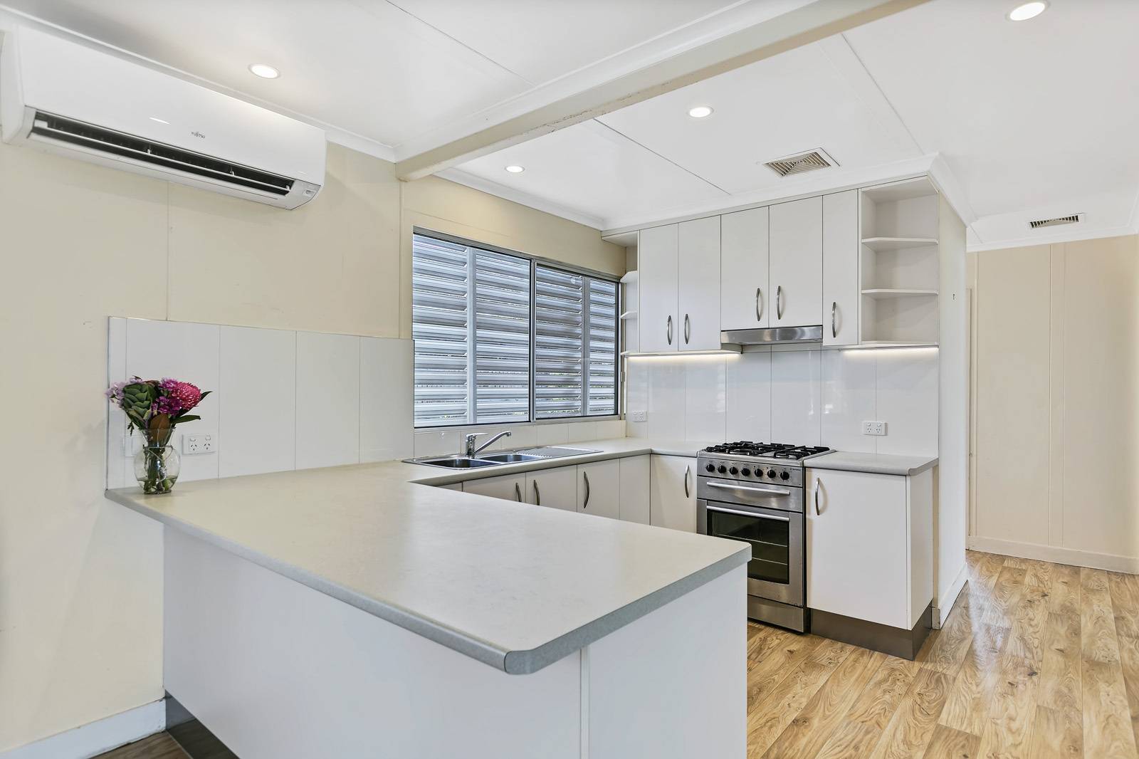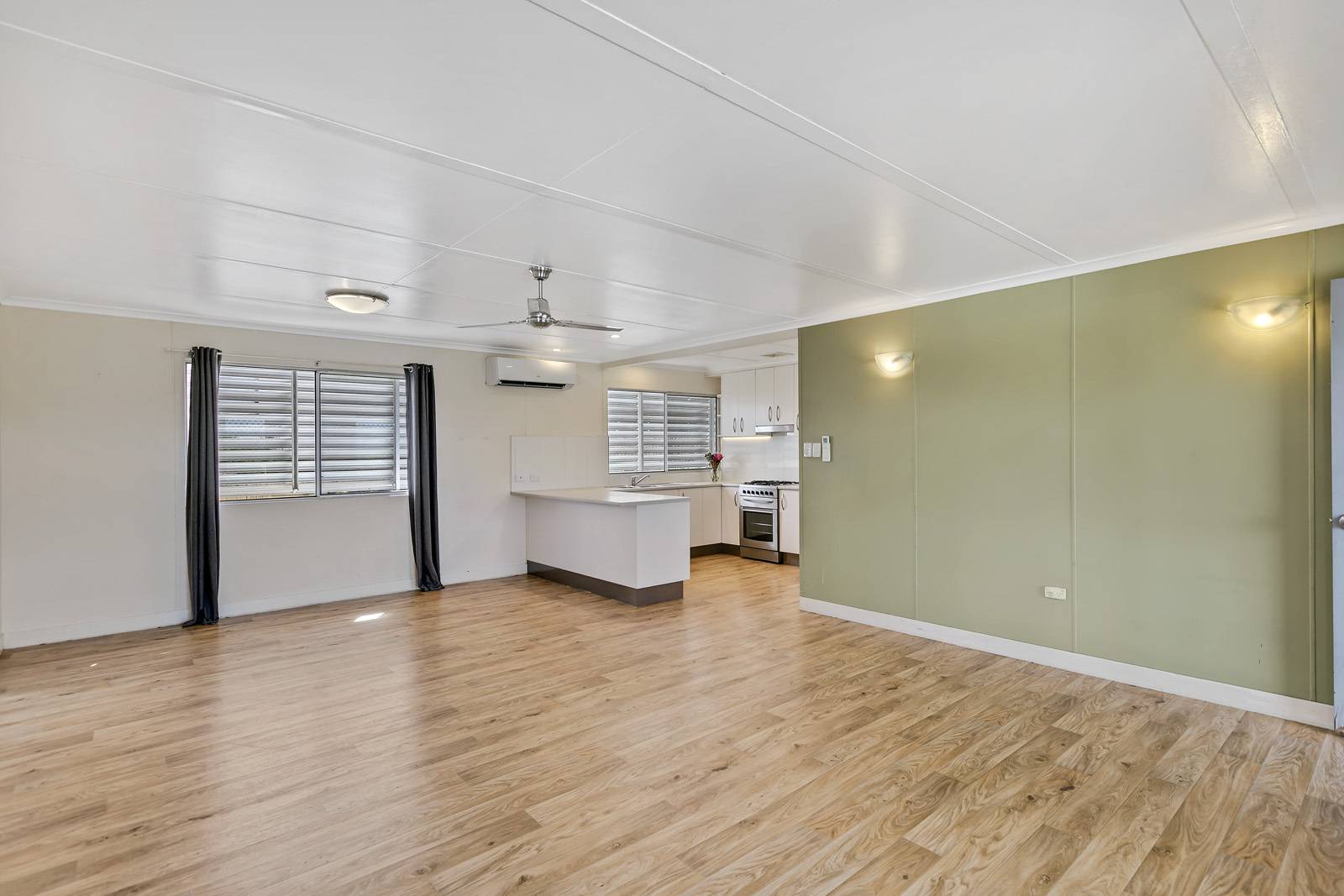 Inside, the home boasts a central open plan living, kitchen, & dining area. There are two bedrooms at the front of the home and two at the rear, one with access to the verandah. A reverse cycle air-conditioner is centrally located.