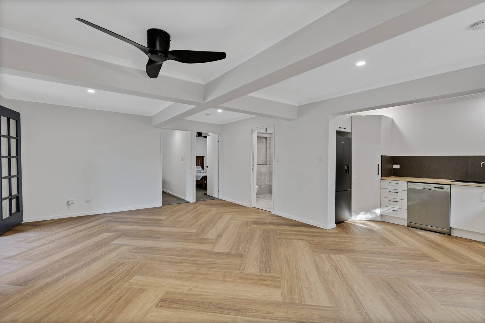 External stairs take you down to the more modern part of the home but still keeping in time with the original Queenslander feel. The open-plan living has access to the pool & outdoor paved entertainment area complete with servery. The corner kitchen has a ceramic cook-top, brand new electric oven & dishwasher. The two built-in bedrooms are of generous size and feature brand new carpet & fans. The bathroom has a walk-in shower & combined toilet.