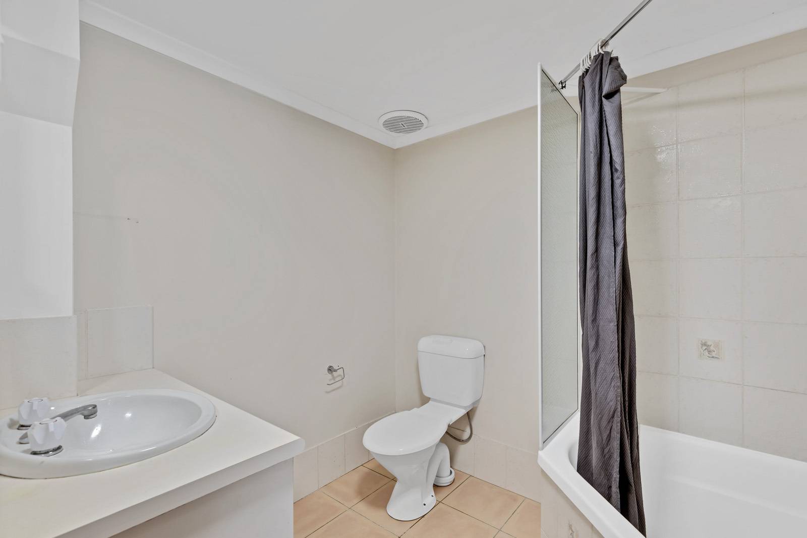The original tiled kitchen is functional and has plenty of storage cupboards, separate pantry, fridge nook, electric oven & cook-top & breakfast bar. Two good sized bedrooms with carpet, fans, built-ins robes, the main opening up onto the north facing balcony & adjoining the two way bathroom. The combined  bathroom and laundry is very functional with shower over corner bath & the laundry tucked away behind a sliding door.